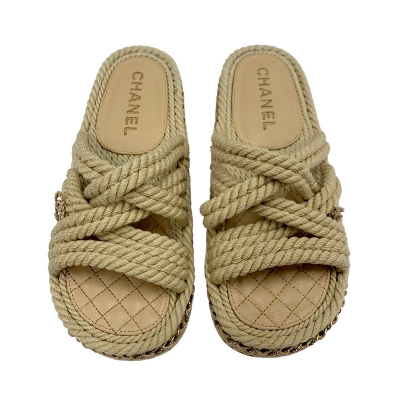 シャネル CHANEL サンダル 靴 シューズ ファブリック レザー ベージュ ココマーク チェーン コード