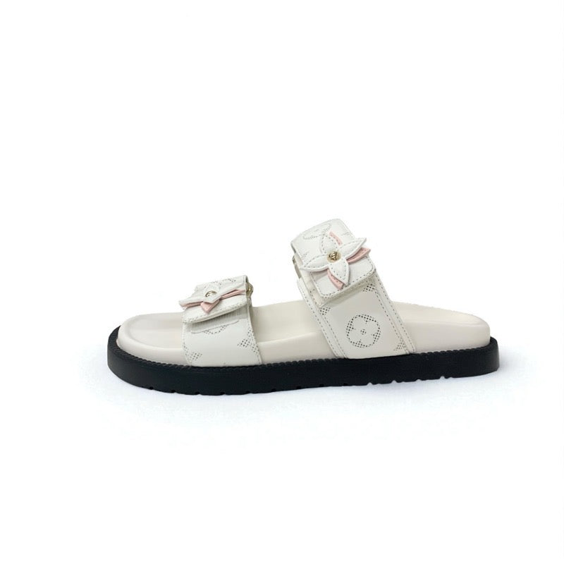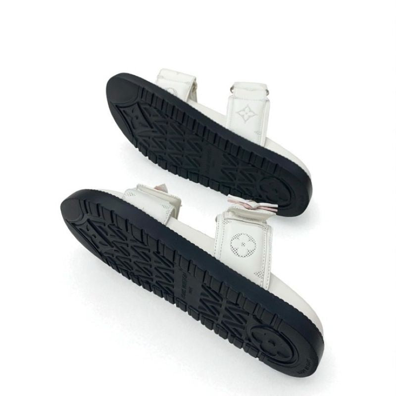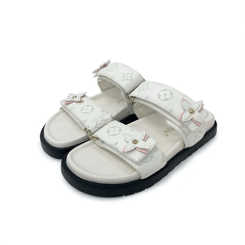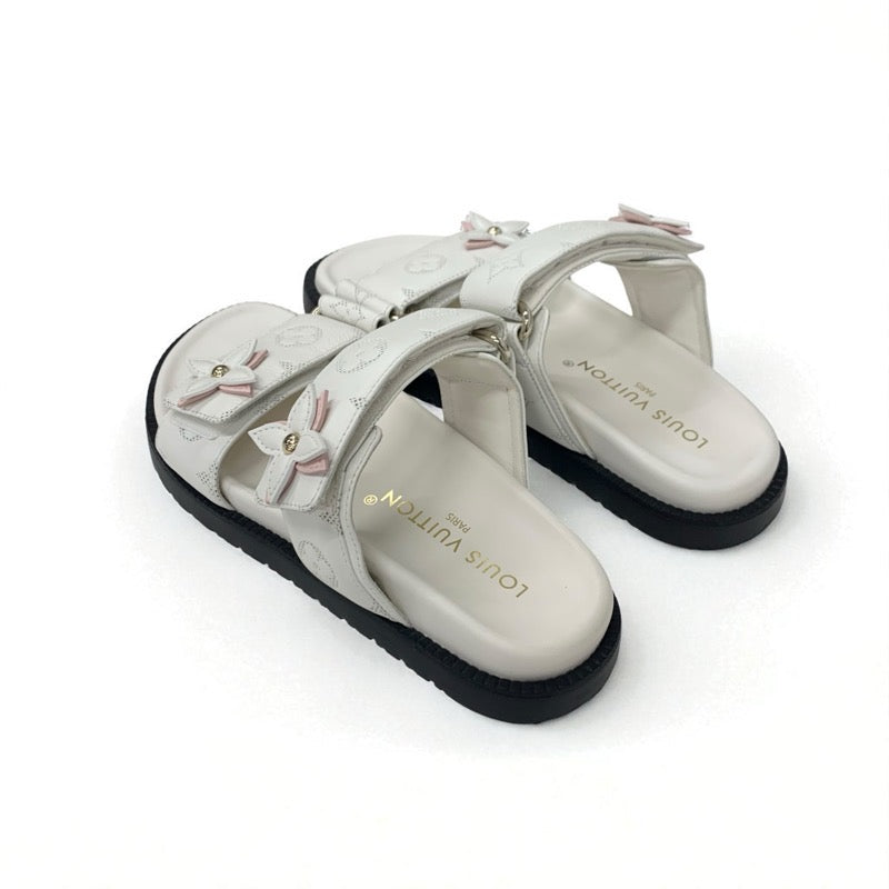 ルイヴィトン LOUIS VUITTON サンセットライン モノグラム サンダル 靴 シューズ レザー ホワイト ピンク 白 コンフォート ミュール フラット ベルクロ ストラップ