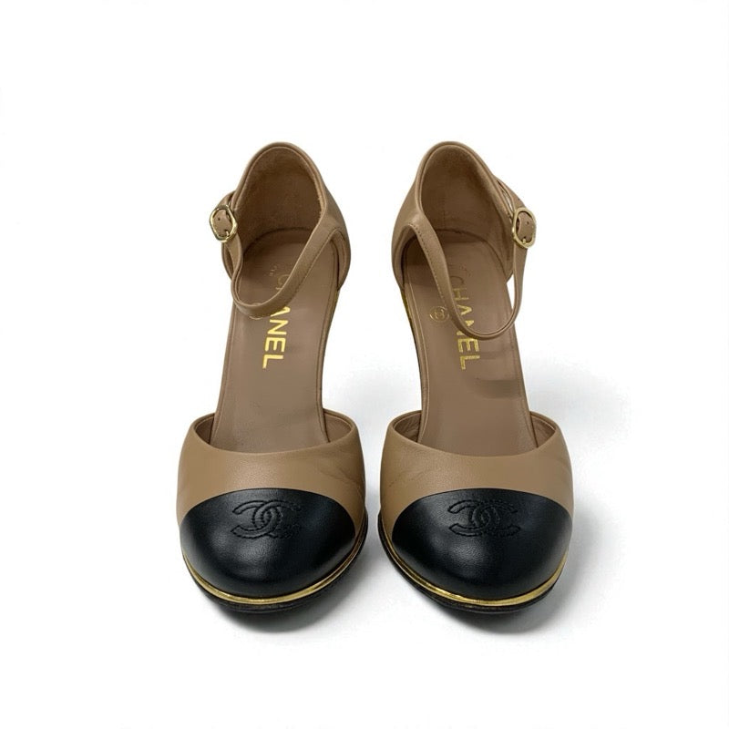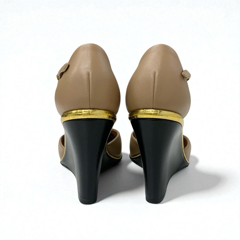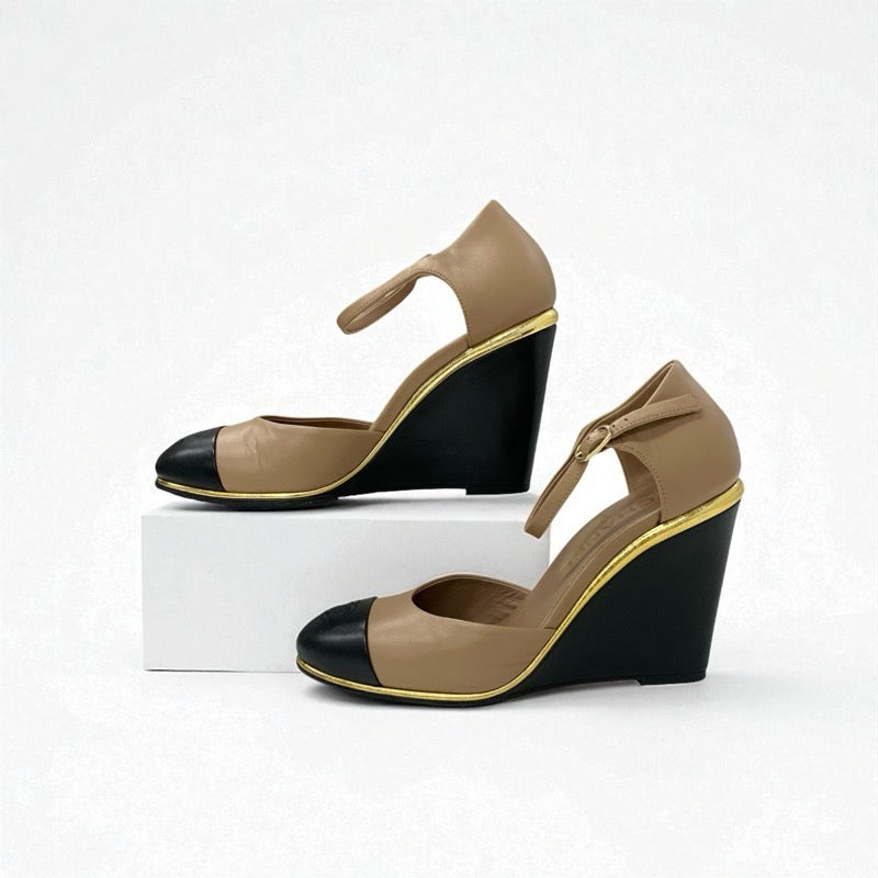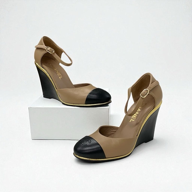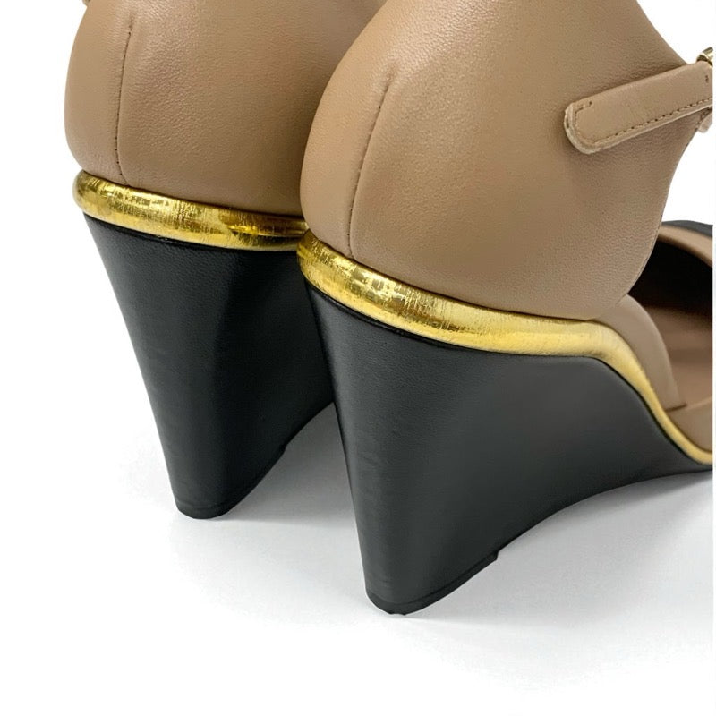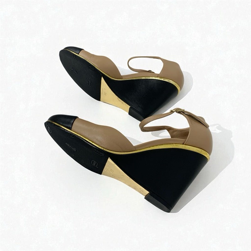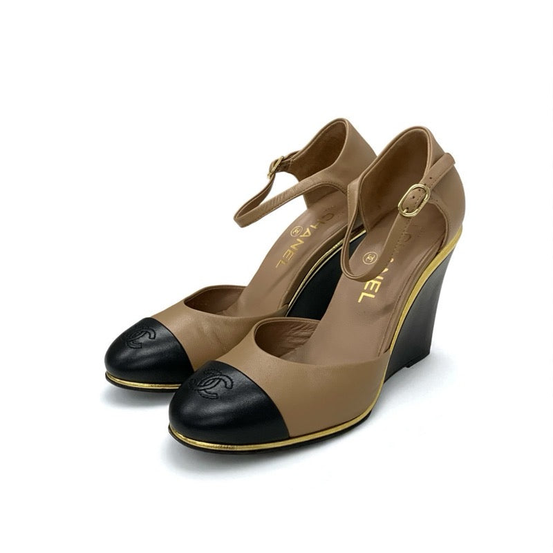 シャネル CHANEL パンプス 靴 シューズ レザー ブラウン ブラック ココマーク ウェッジソール ストラップ