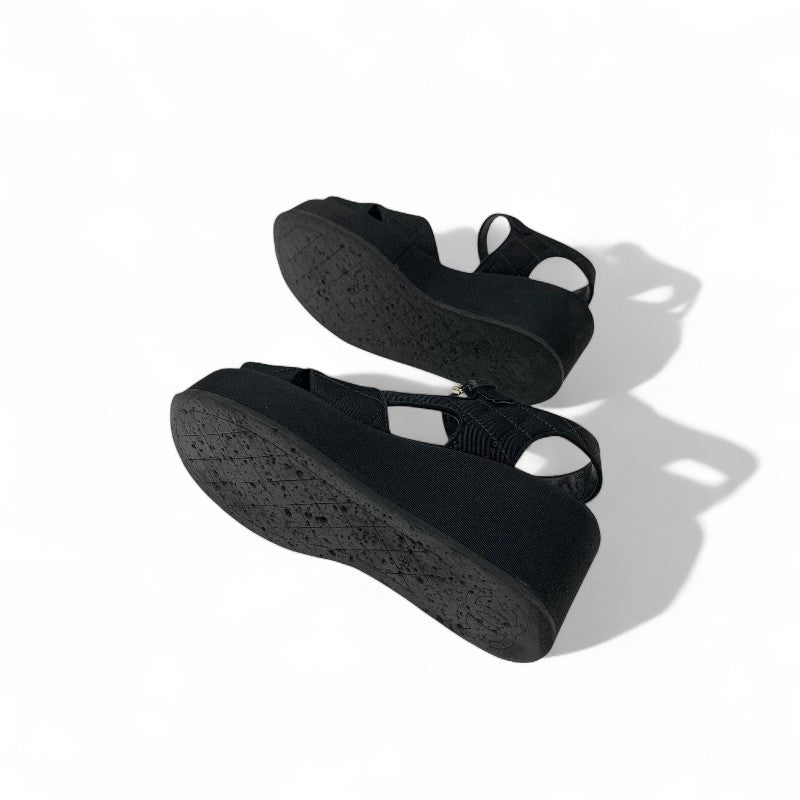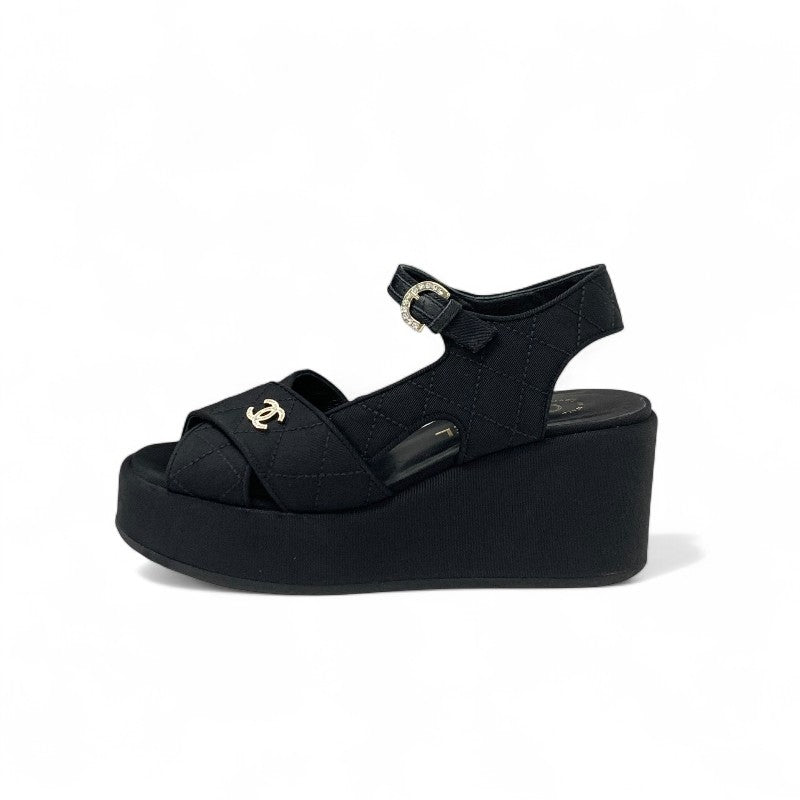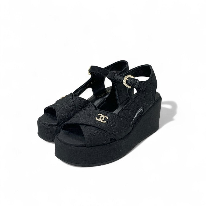 シャネル CHANEL サンダル 靴 シューズ ファブリック ブラック 黒 ココマーク マトラッセ ウェッジソール ラインストーン