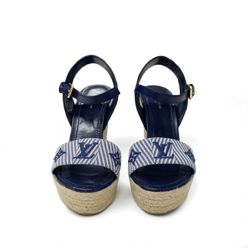 ルイヴィトン LOUIS VUITTON セイルアウェイライン モノグラム サンダル 靴 シューズ キャンバス レザー ネイビー ウェッジソール ストラップ