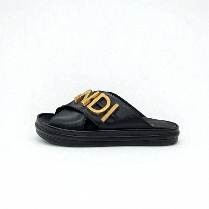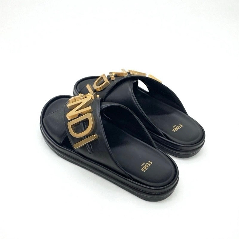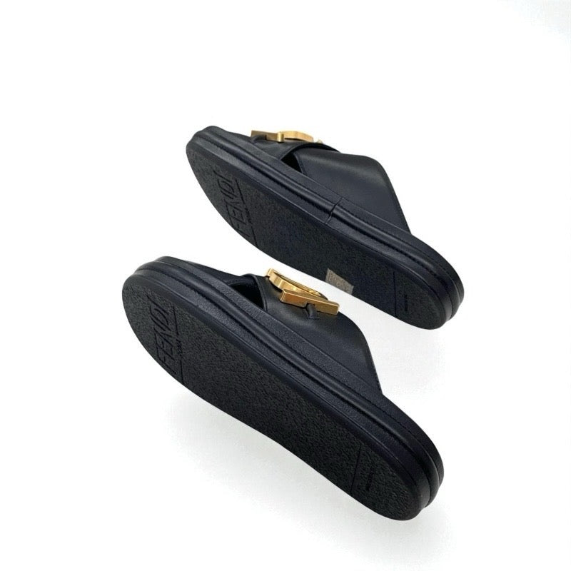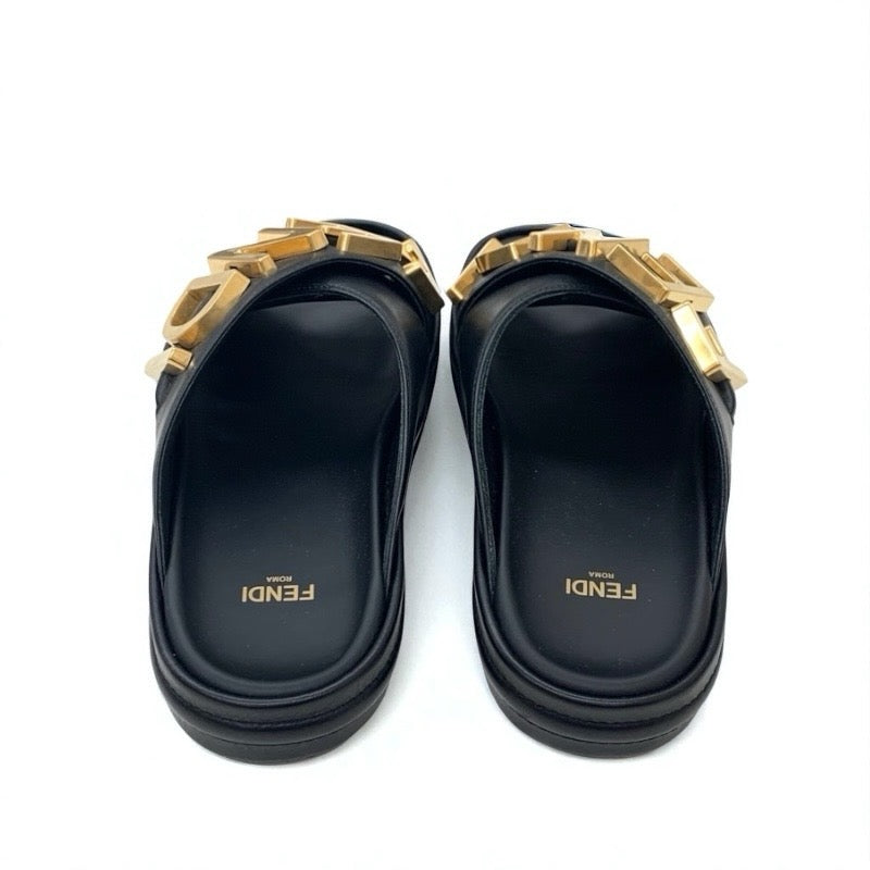 フェンディ FENDI サンダル 靴 シューズ レザー ブラック ゴールド ロゴ フラットサンダル