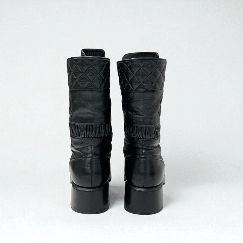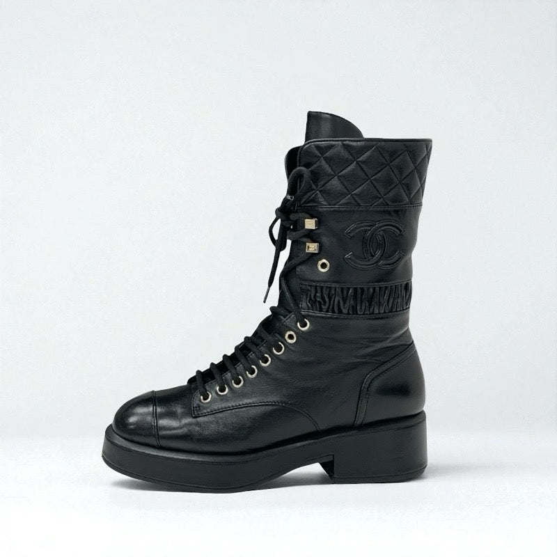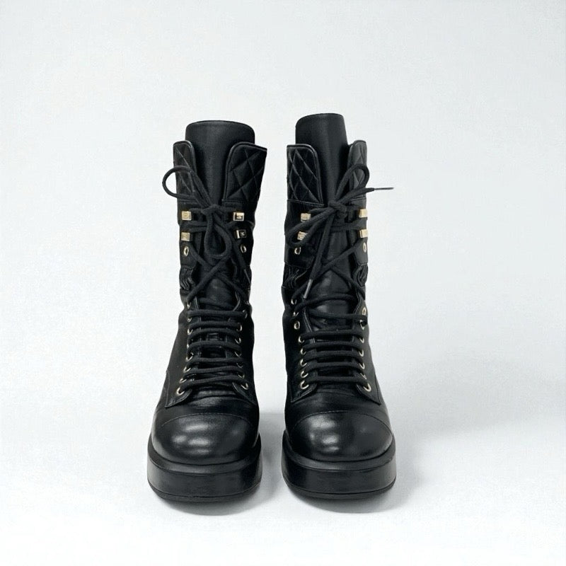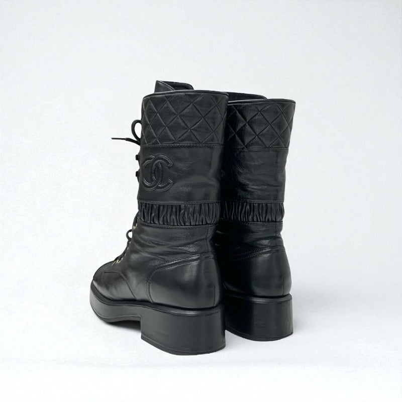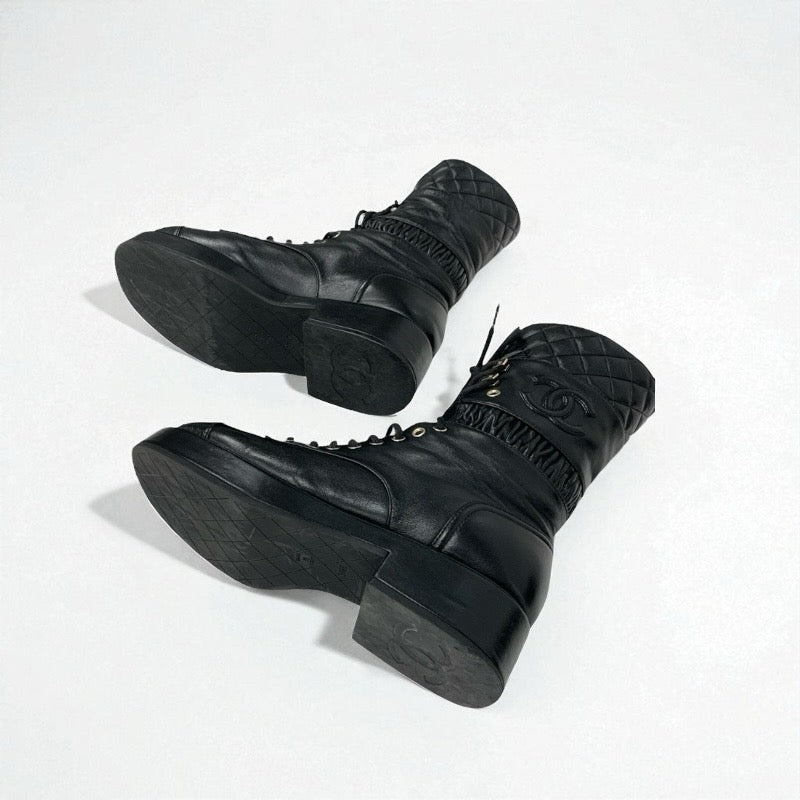 シャネル CHANEL ブーツ ショートブーツ 靴 シューズ レザー ブラック 黒 ココマーク マトラッセ レースアップ ミドルブーツ