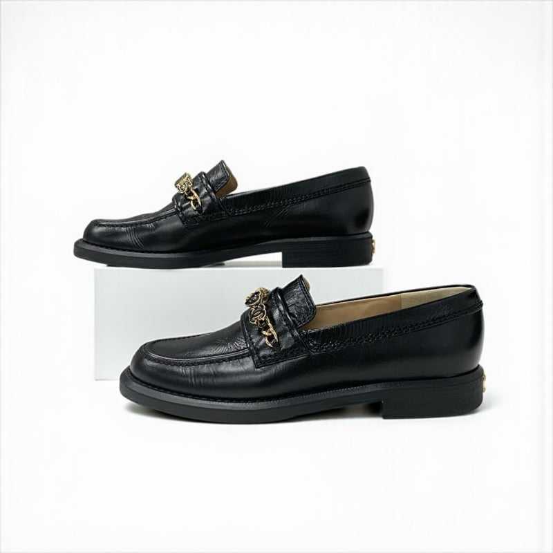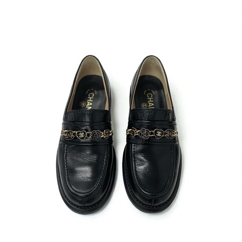 シャネル CHANEL ローファー 革靴 靴 シューズ レザー ブラック 黒 ゴールド ココマーク チェーン アイコン