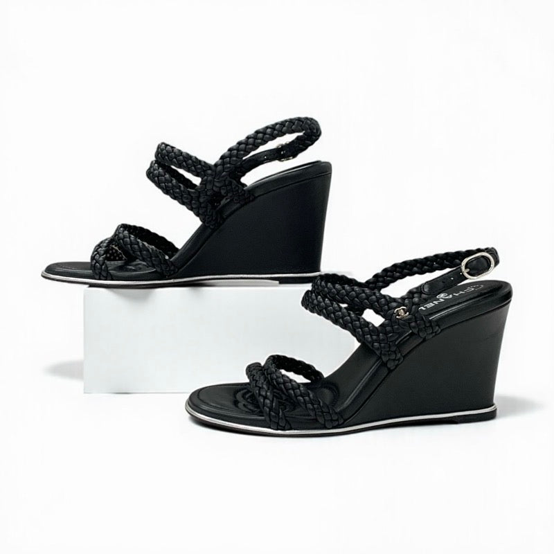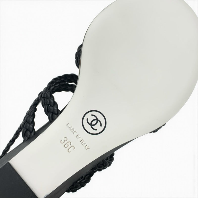 シャネル CHANEL サンダル 靴 シューズ レザー ブラック 黒 ストラップ ココマーク 編み込み ウェッジソール
