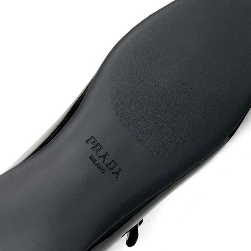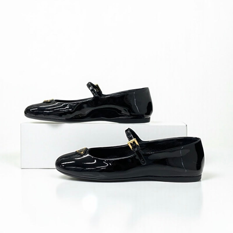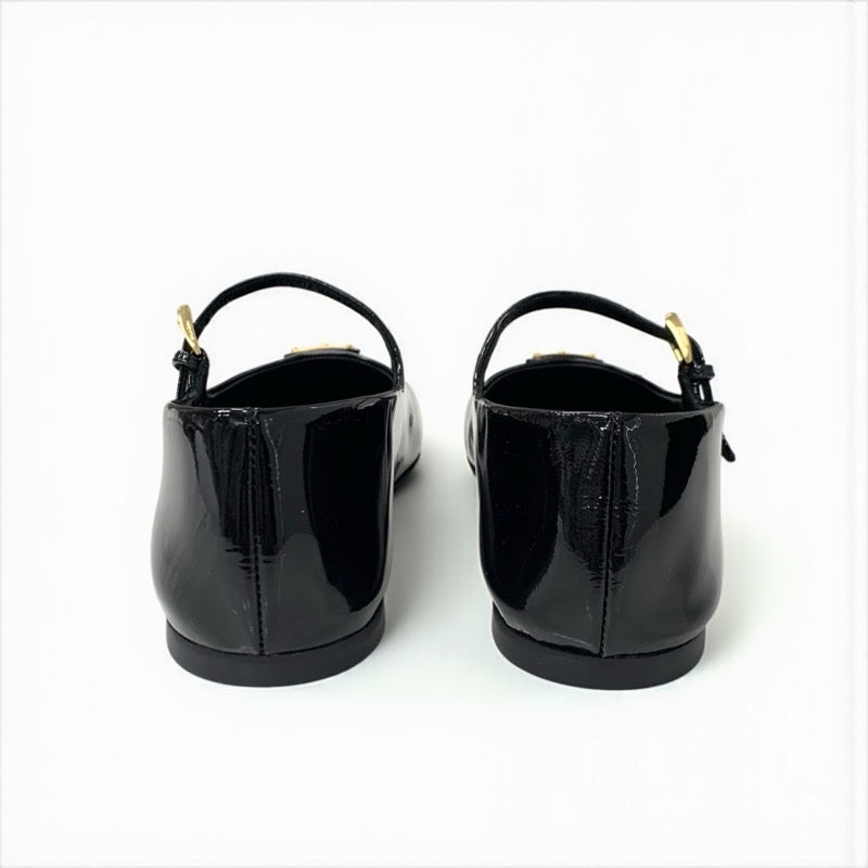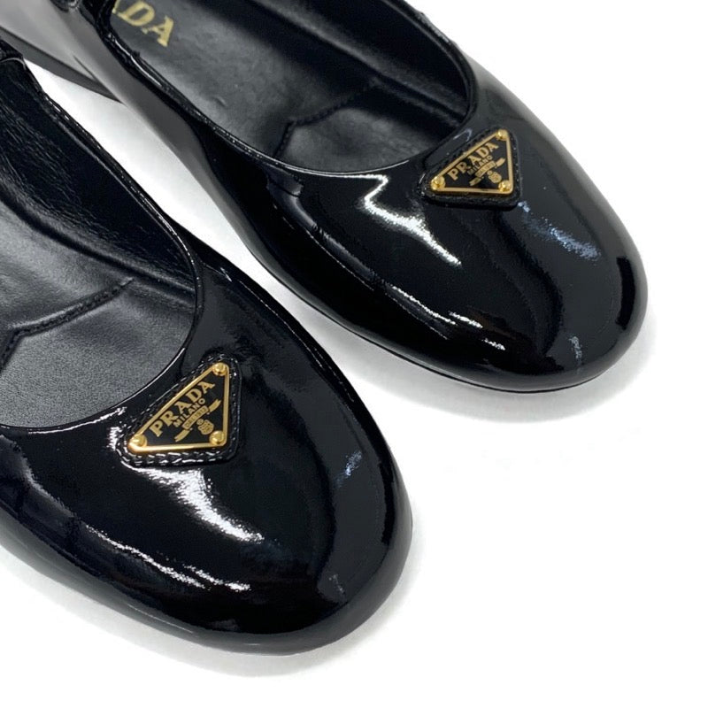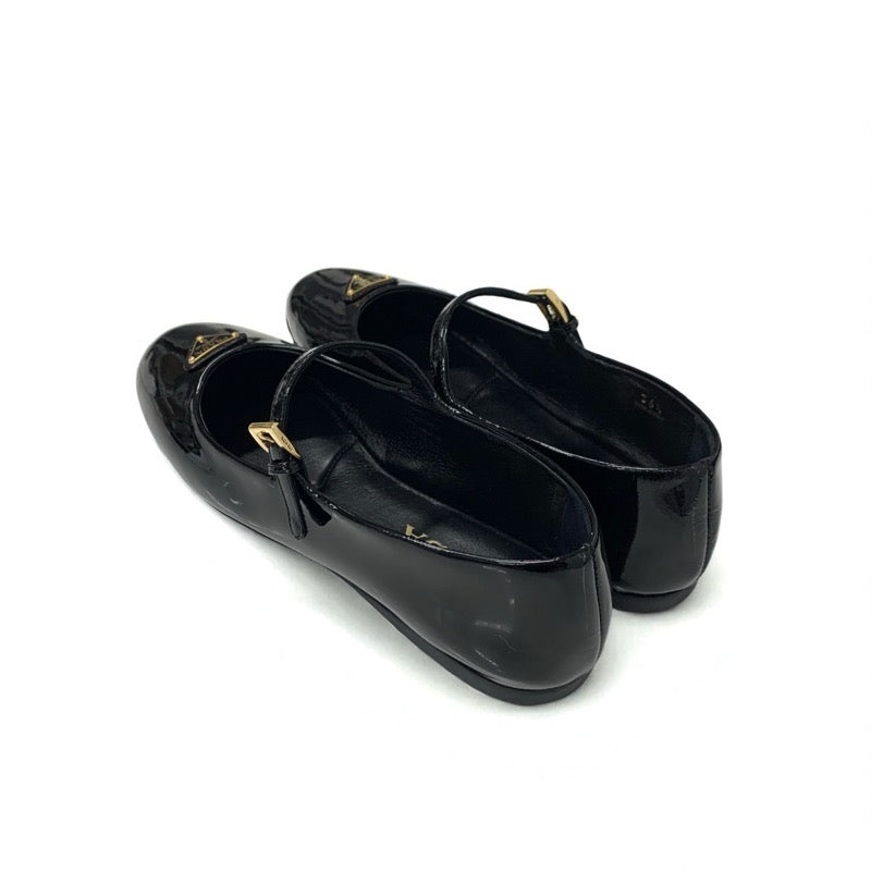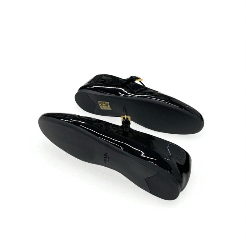 プラダ PRADA フラットシューズ 靴 シューズ パテント ブラック 黒 ゴールド 未使用 トライアングルロゴ ストラップ バレリーナ