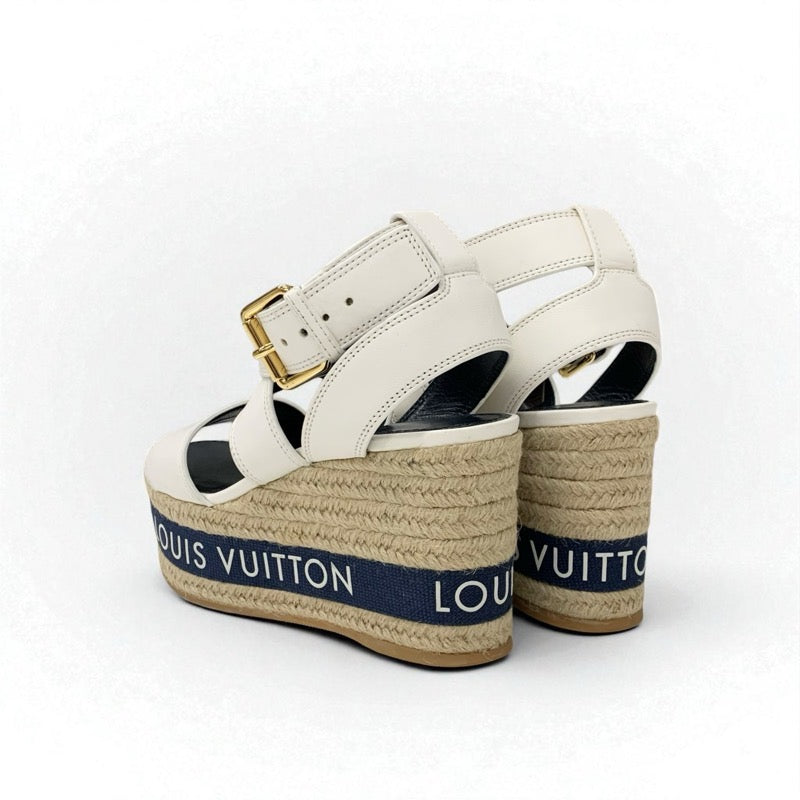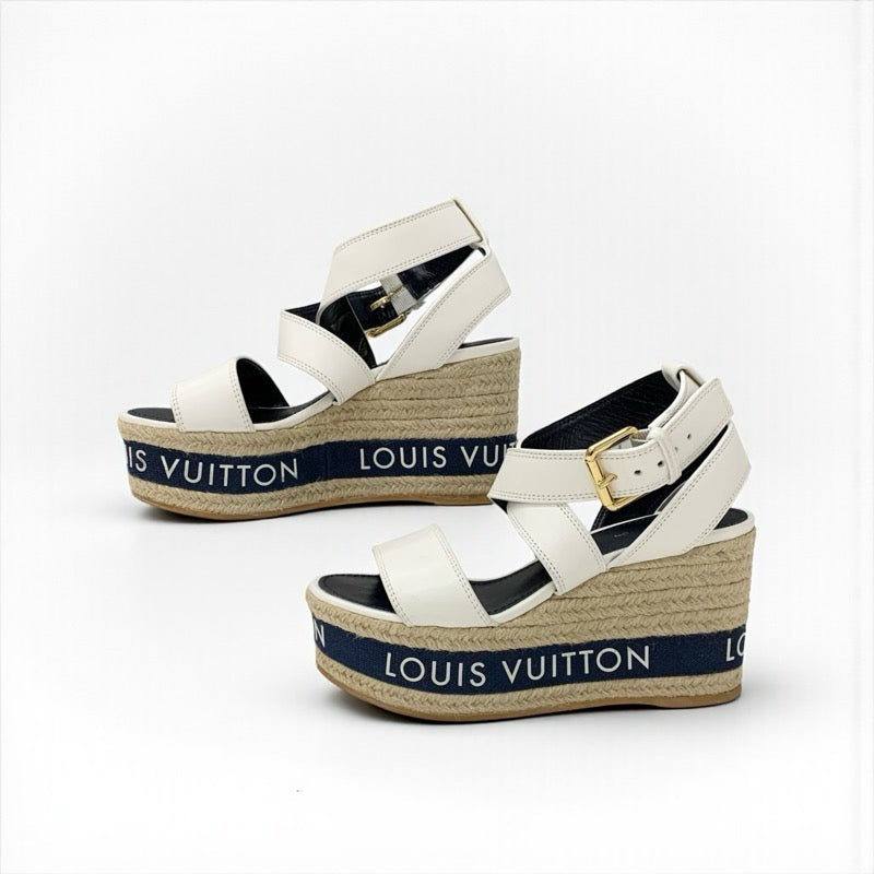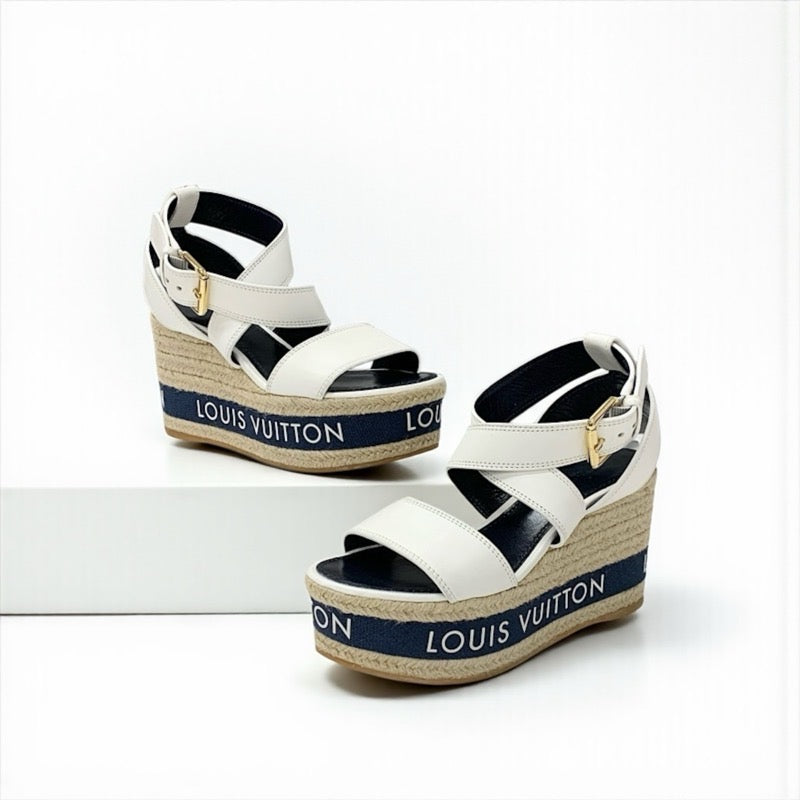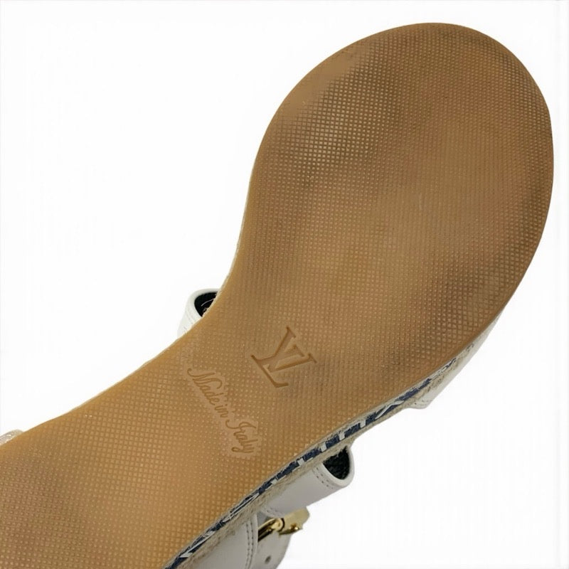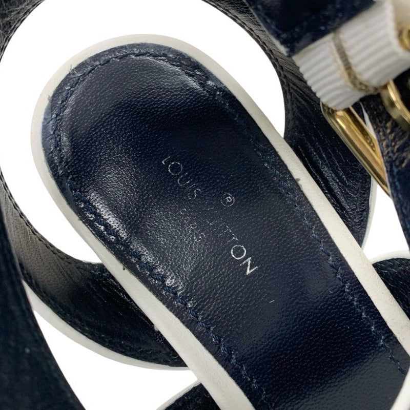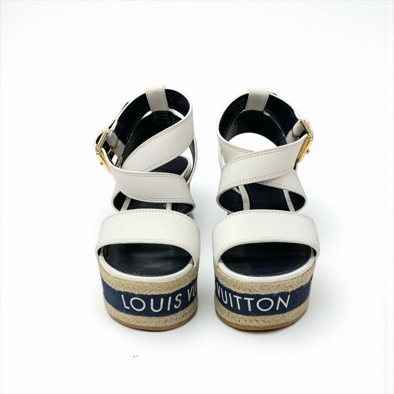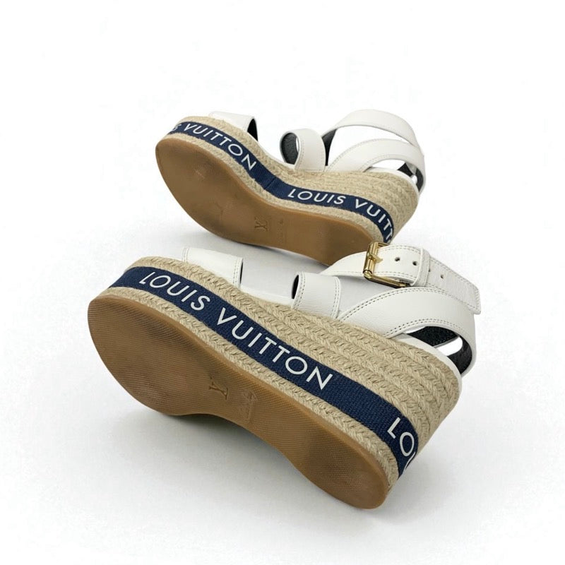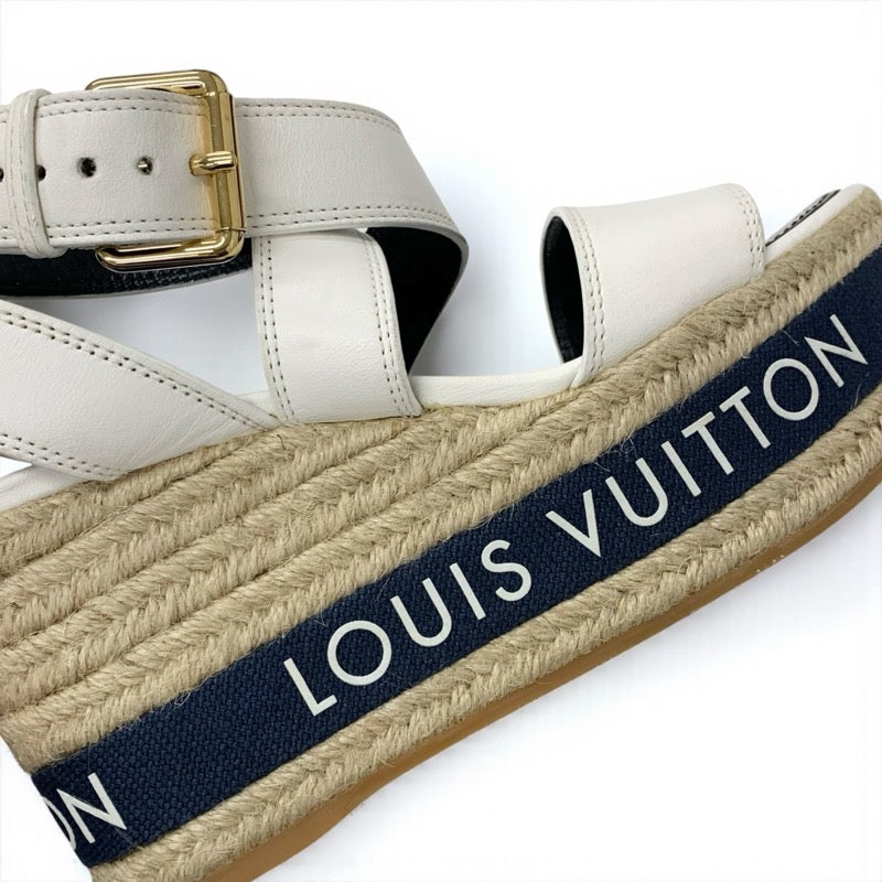 ルイヴィトン LOUIS VUITTON バウンダリーライン サンダル 靴 シューズ レザー ホワイト ネイビー ロゴ ウェッジソール アンクルストラップ